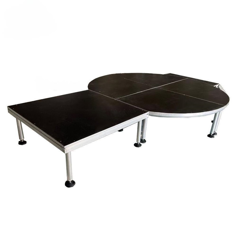 La scène portable à structure en aluminium à verrouillage rapide est disponible en plusieurs dimensions standard, notamment 1,20 m x 2,40 m, 1,20 m x 1,20 m et 1 m x 2 m. Des dimensions sur mesure sont également proposées pour répondre aux besoins spécifiques de chaque événement. La forme de la plateforme est personnalisable : carrée, circulaire, triangulaire, en quart de cercle, rectangulaire, ovale ou irrégulière. Cette flexibilité permet de créer des configurations scéniques uniques et fonctionnelles.